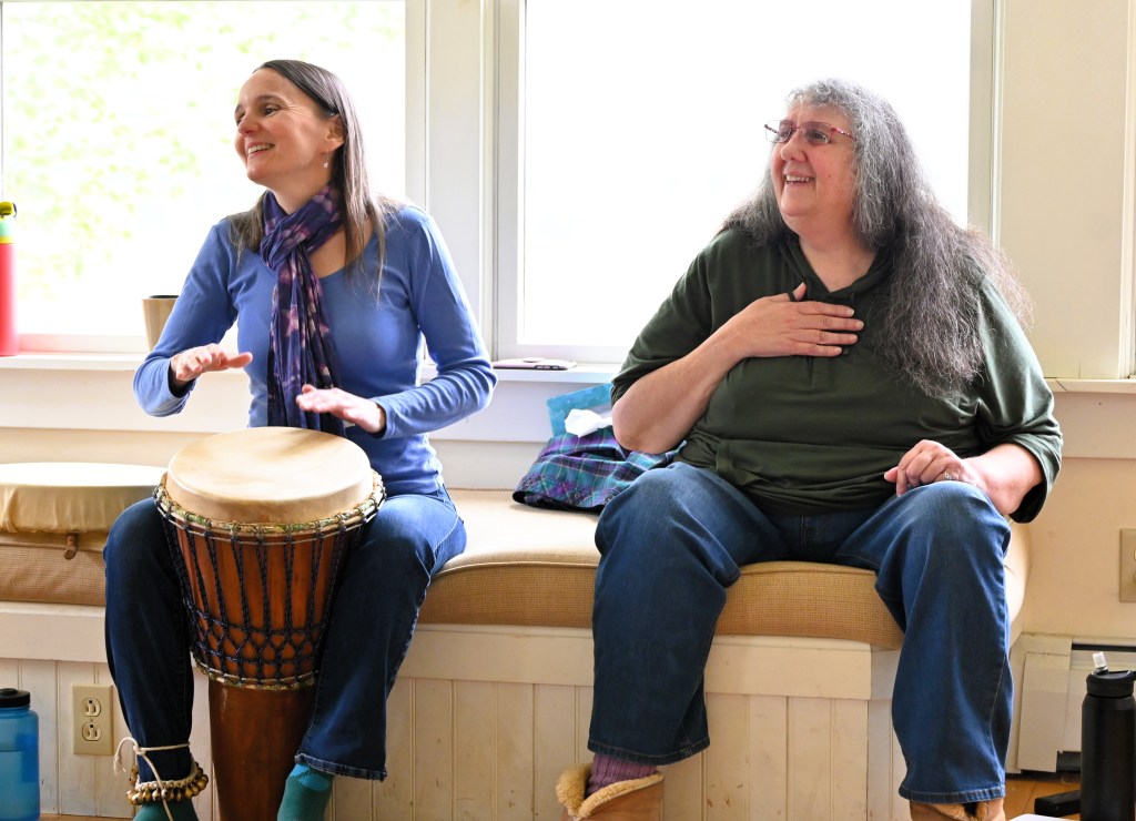 Heather & Bernice leading a community sing at the first Heart Songs & Circle Songs Singing Retreat in Pittsford, VT May 3-5, 2024. (Photo by Jenny Riegler)